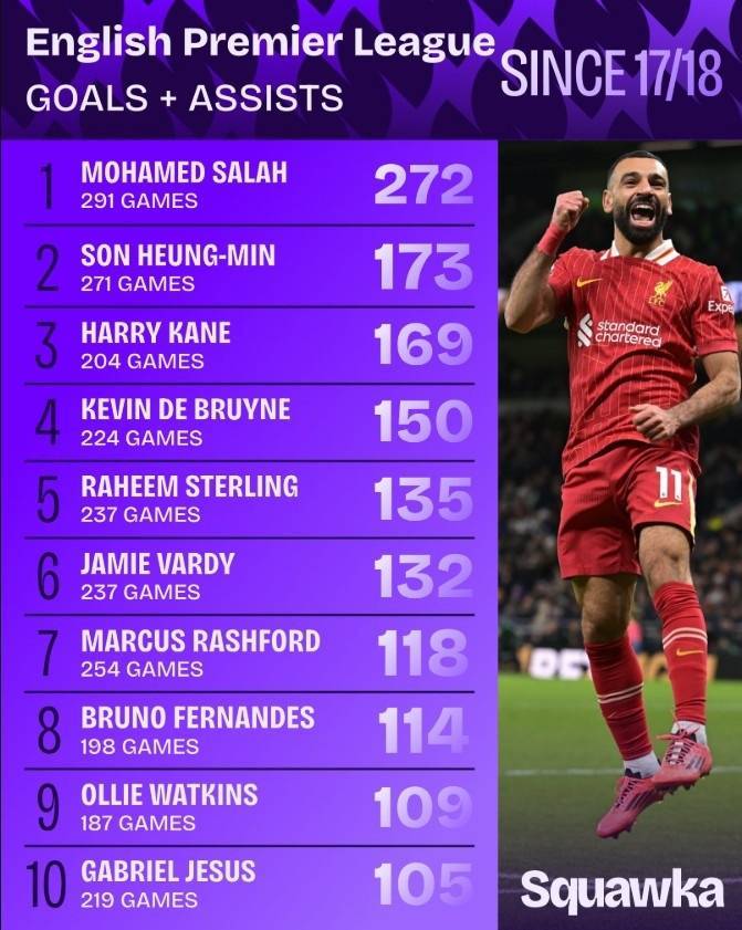同期断层领先!17-18赛季以来,萨拉赫英超291场直接参与272球